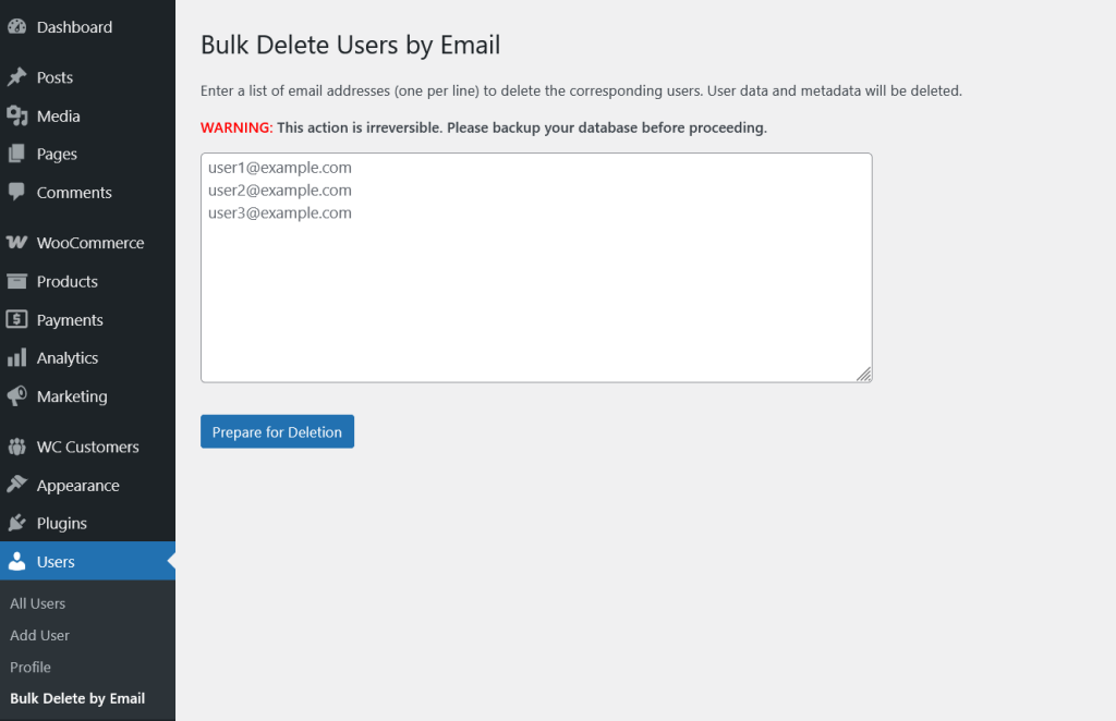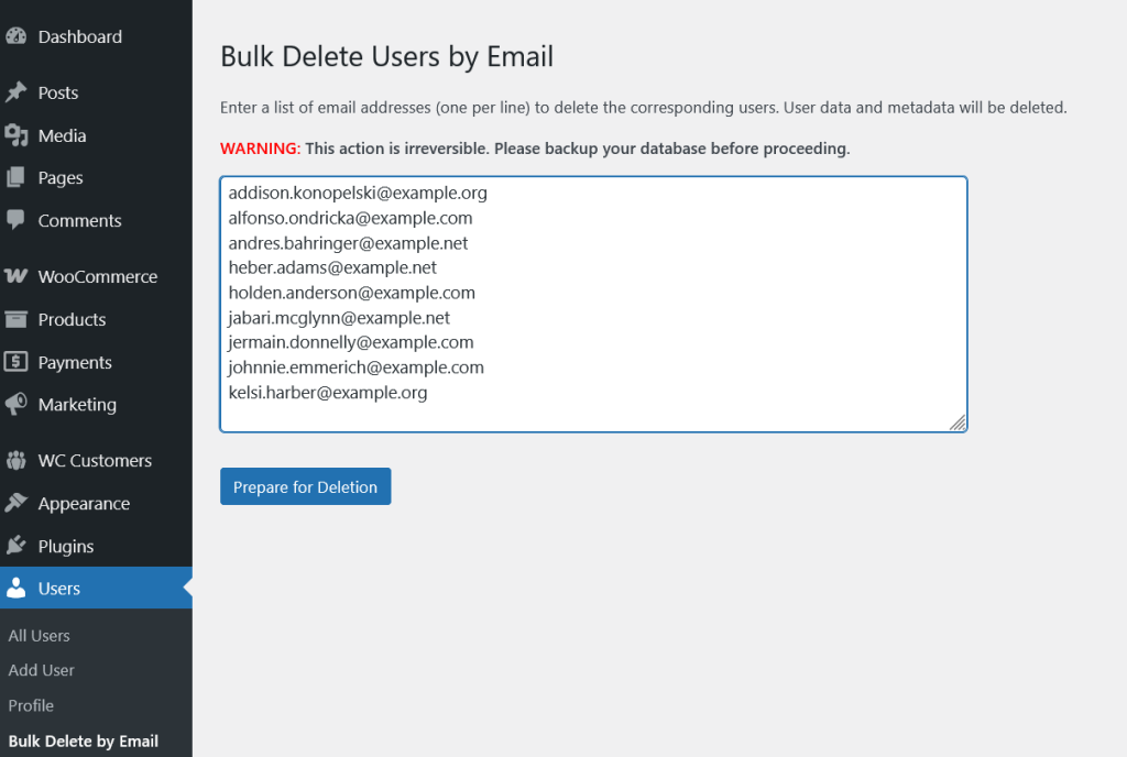Instead of searching for each user account individually in your WordPress dashboard, there’s an option to provide a list of email addresses and delete all matching accounts in one operation.
