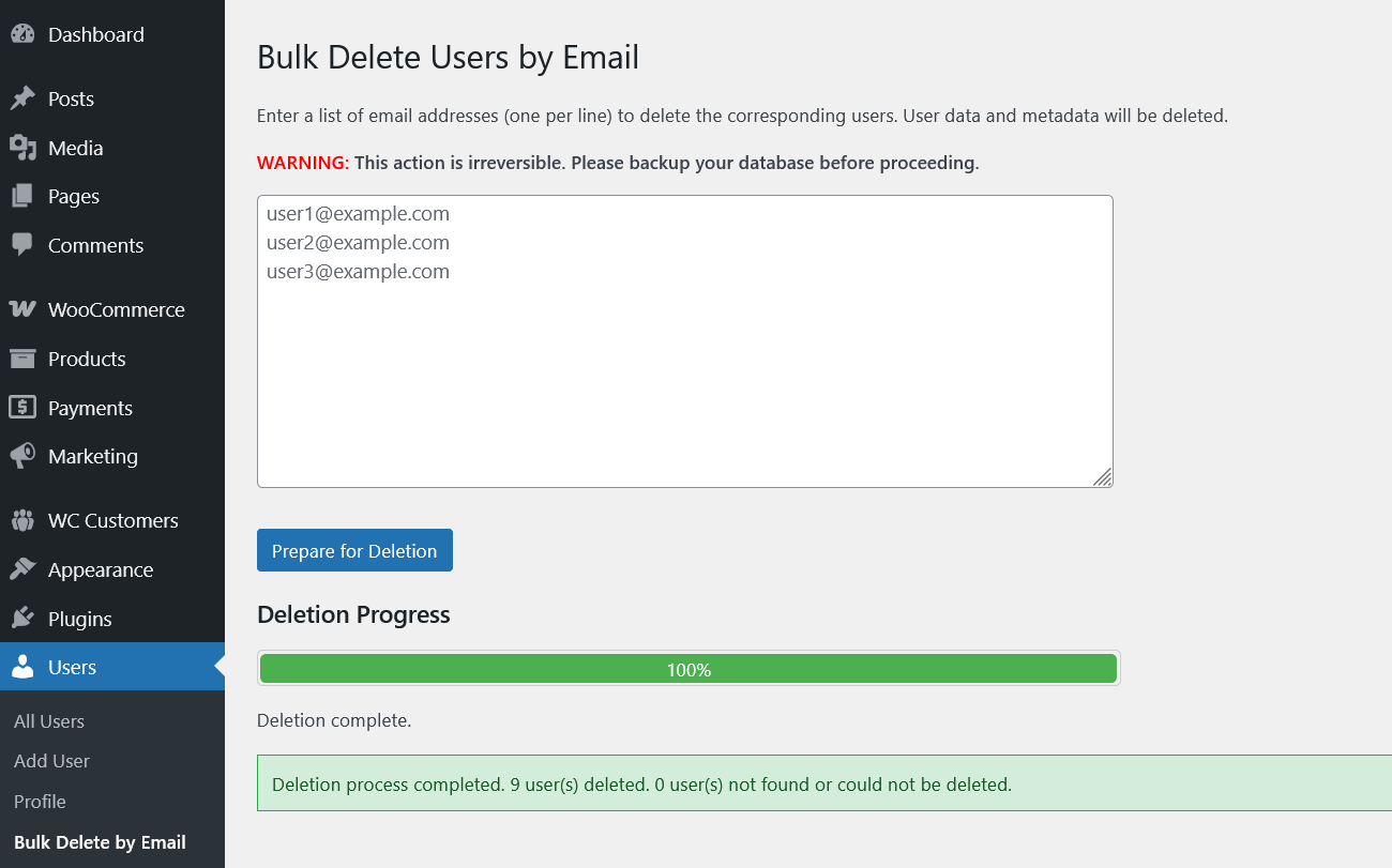 User deletion is permanent and irreversible. The plugin deletes all user data and metadata, and there will be no option for attributing content to another user. Always back up your database before performing bulk deletions, especially for large operations!