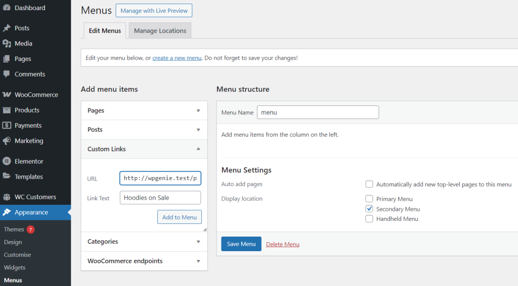 From WP Dashboard – Appearance – Menus, give your menu a name, then click Create Menu. From Add menu items choose Custom links, add URL parameter of chosen category, with /?onsale at the end. Add Link text that you want to be displayed, then click Add to Menu.
