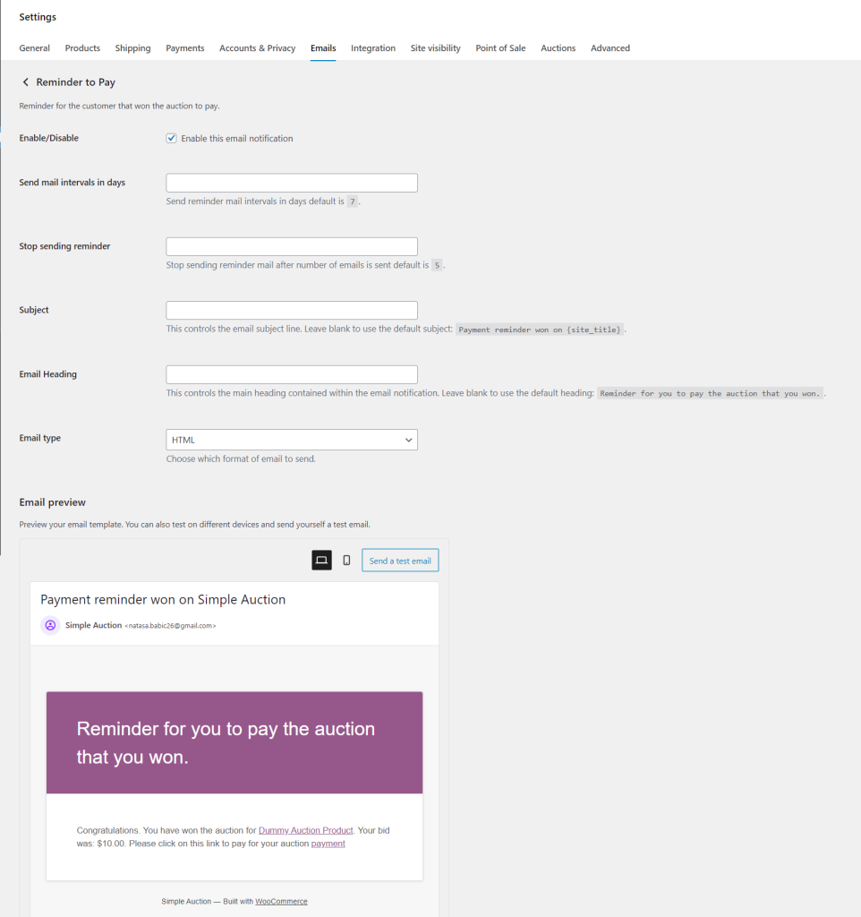 If the winner doesn’t pay, Simple Auctions can automatically send payment reminder emails. You control how often these reminders go out (default is every 7 days) and how many reminders to send before stopping.