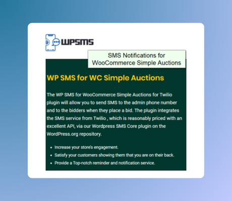 To implement SMS notifications feature for WSA you will need two additional plugins WP SMS for WordPress (free) and WP SMS For WooCommerce Simple Auctions ($29). Next requirement is Twilio account to enable using their API for send SMS messages. In case you encounter any issue with setup you can always reach us via support ticket system and we will help you with setup.