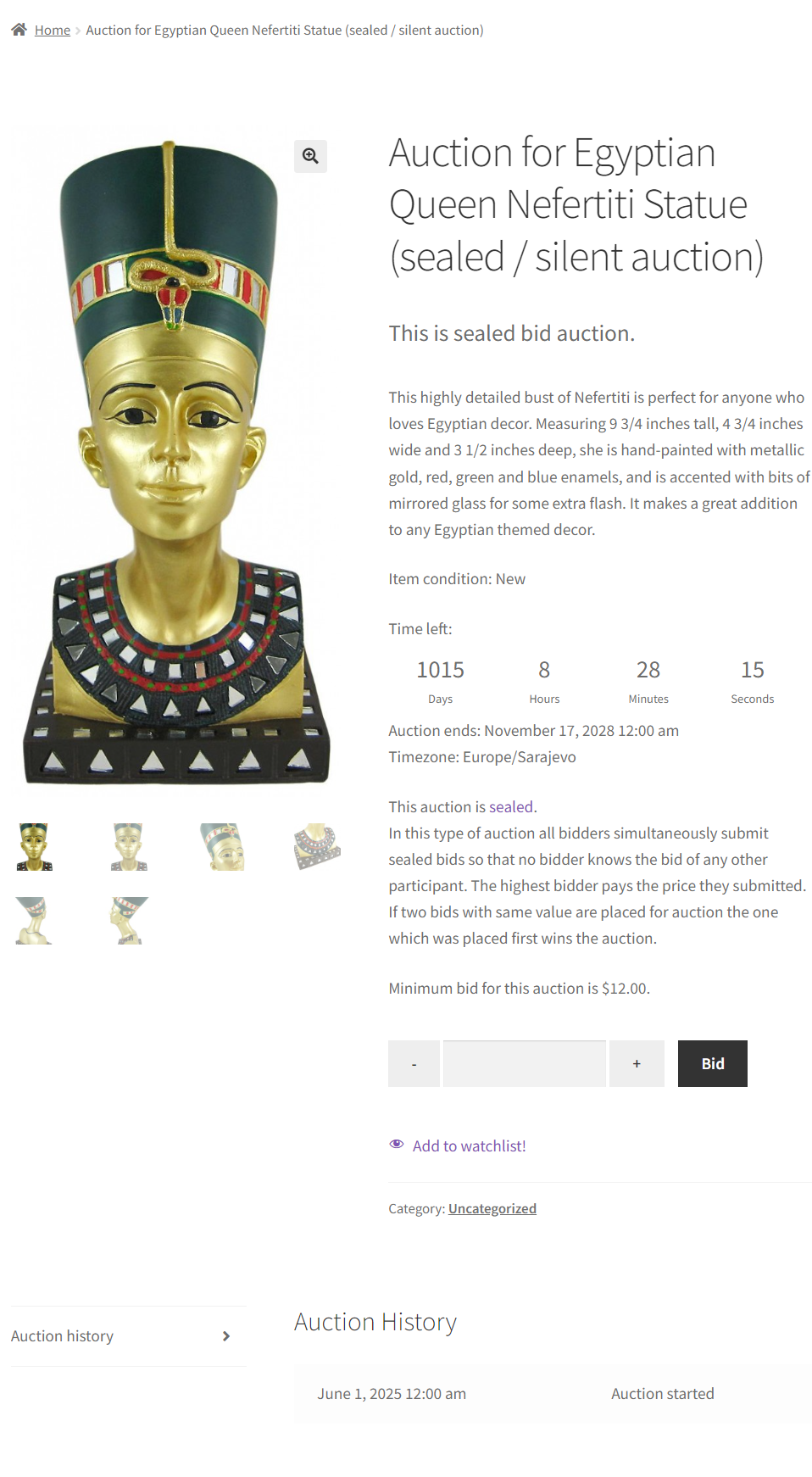 With our auction plugin you can setup WordPress auction website and start auctions in less than 30 minutes (assuming you have payment processor account ready). Plugin integrates seamlessly with WooCommerce and no special knowledge is needed (same level like for standard WooCommerce usage).